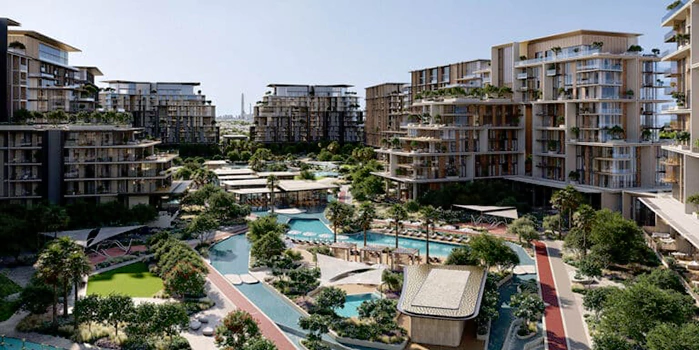 The villas and townhouses feature open-plan layouts, double-height ceilings, hardwood flooring, marble countertops, and sleek aluminum façades — offering a modern and elegant living space.