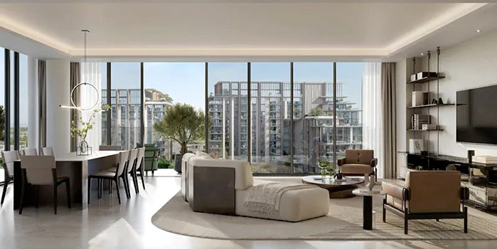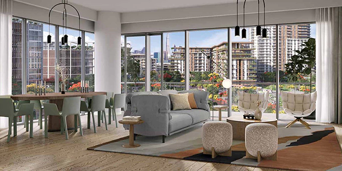 ویلاها و تاونها با طراحی باز (Open-plan)، سقفهای بلند دوطبقه، کفهای چوب سخت، کانترهای از سنگ چینی و نمای آلومینیومی شیک، فضایی معاصر و جذاب